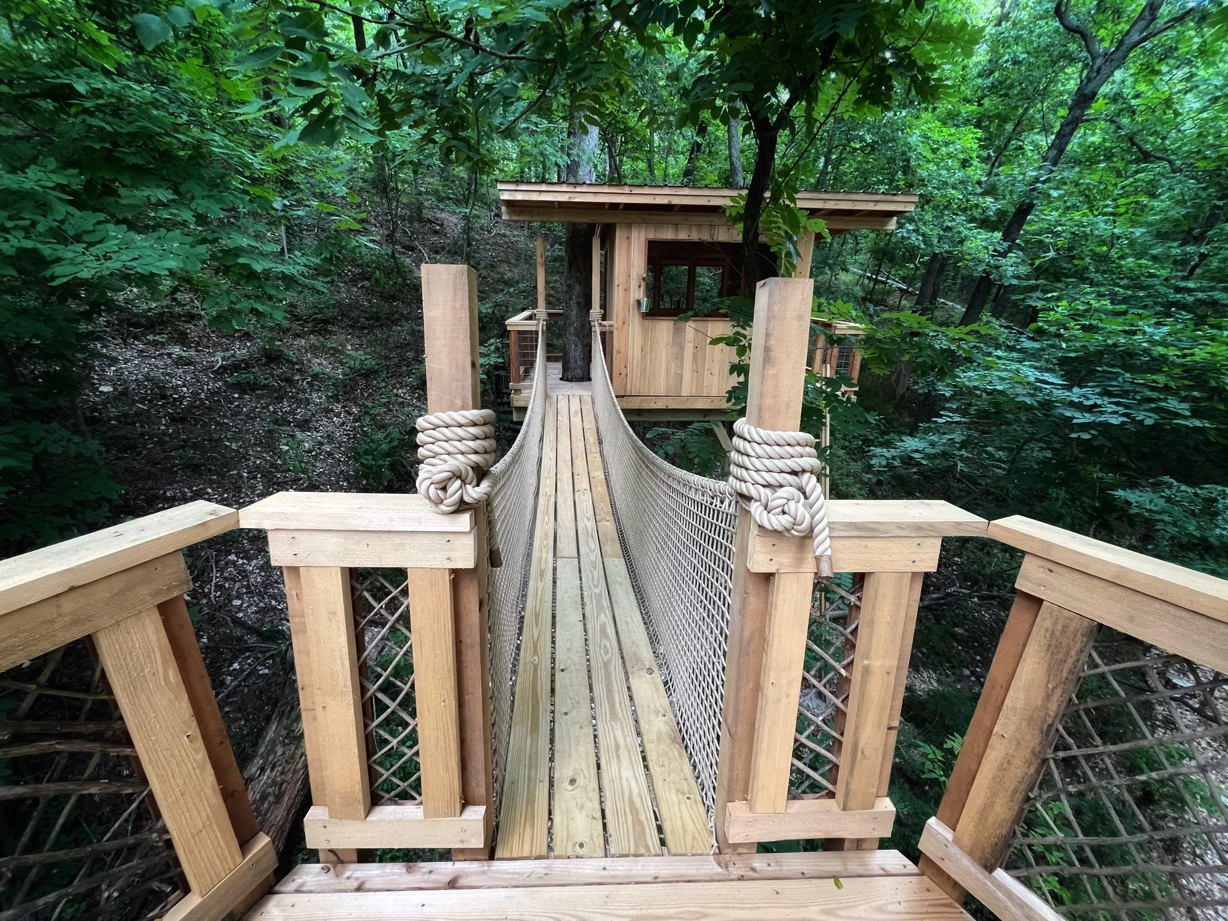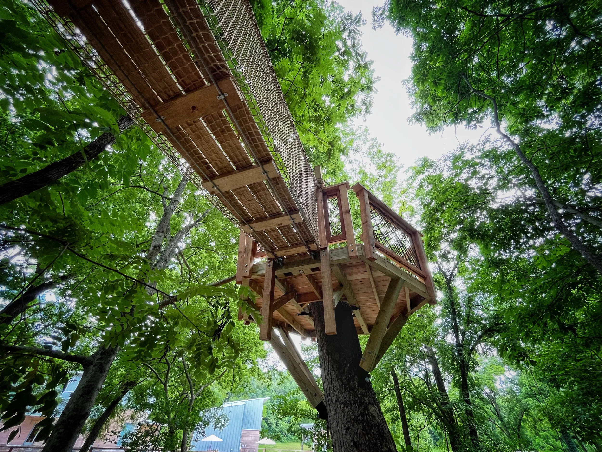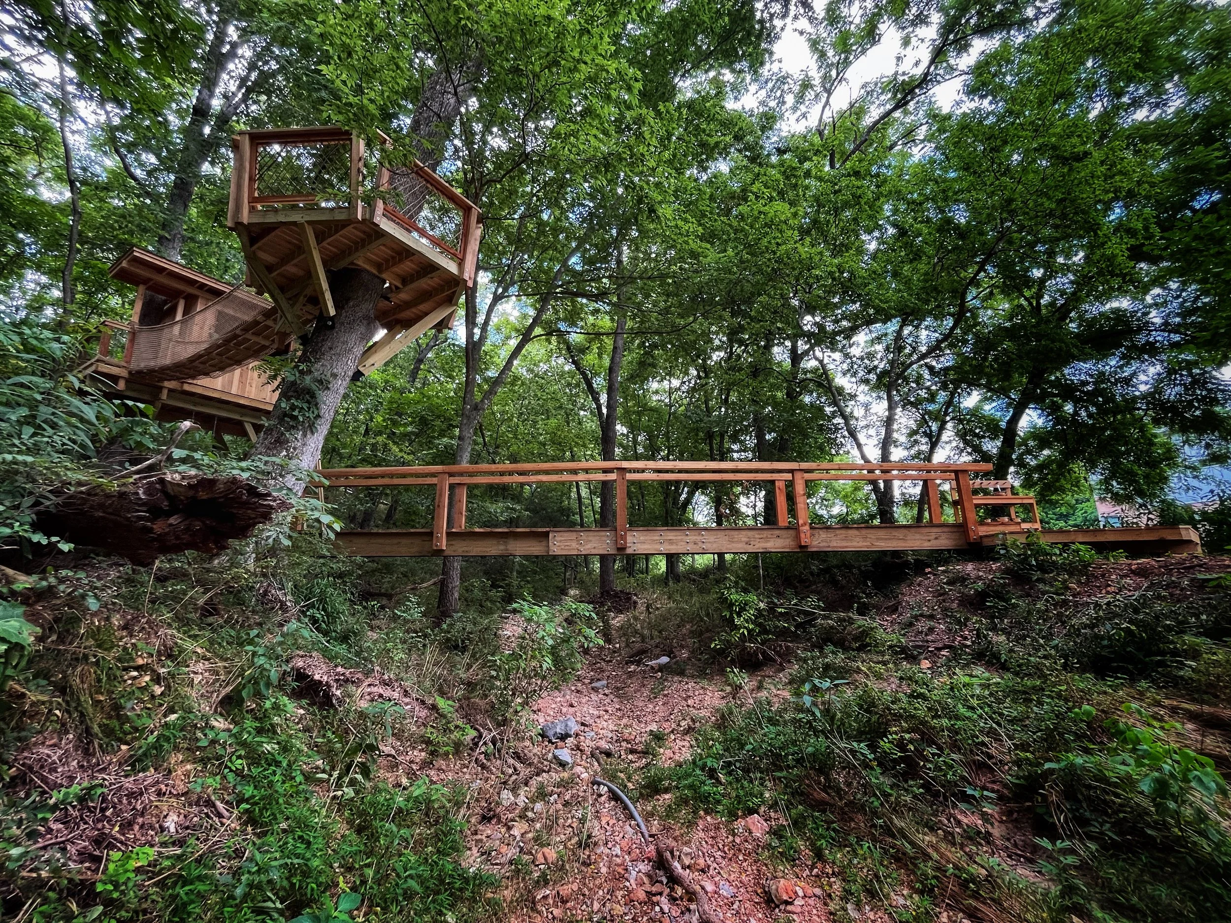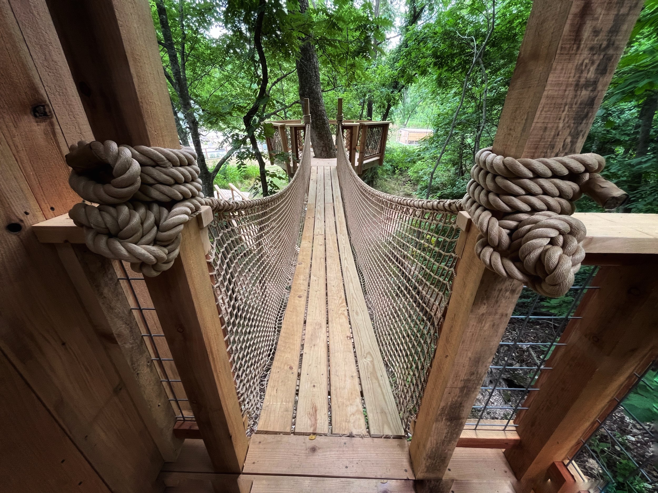 Backyard treehouse playground featuring multiple treehouse spaces and bridges, natural elements throughout and even a play “mud” kitchen.