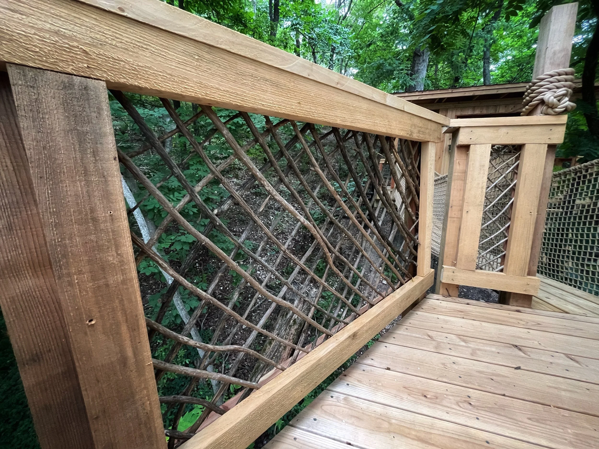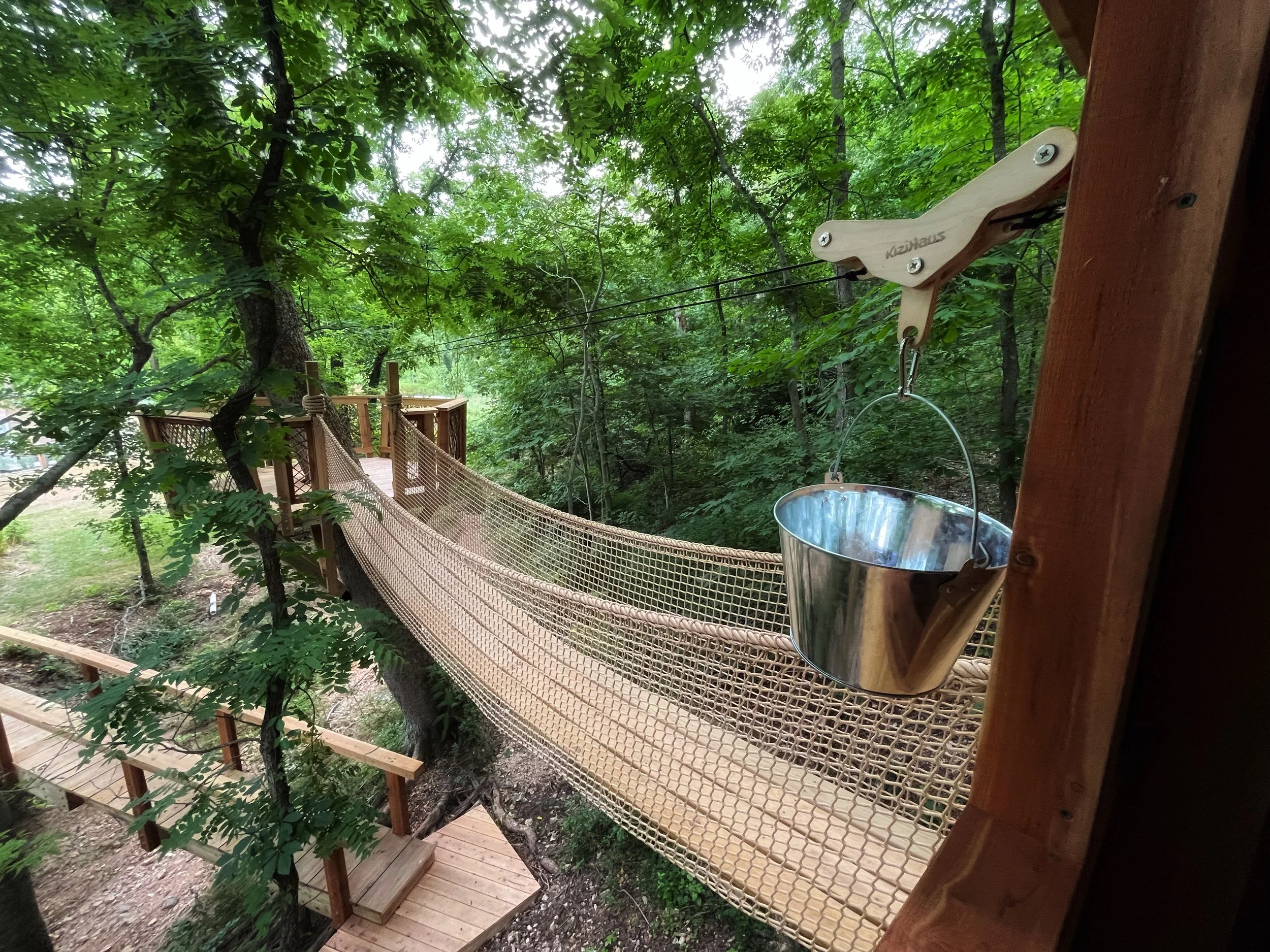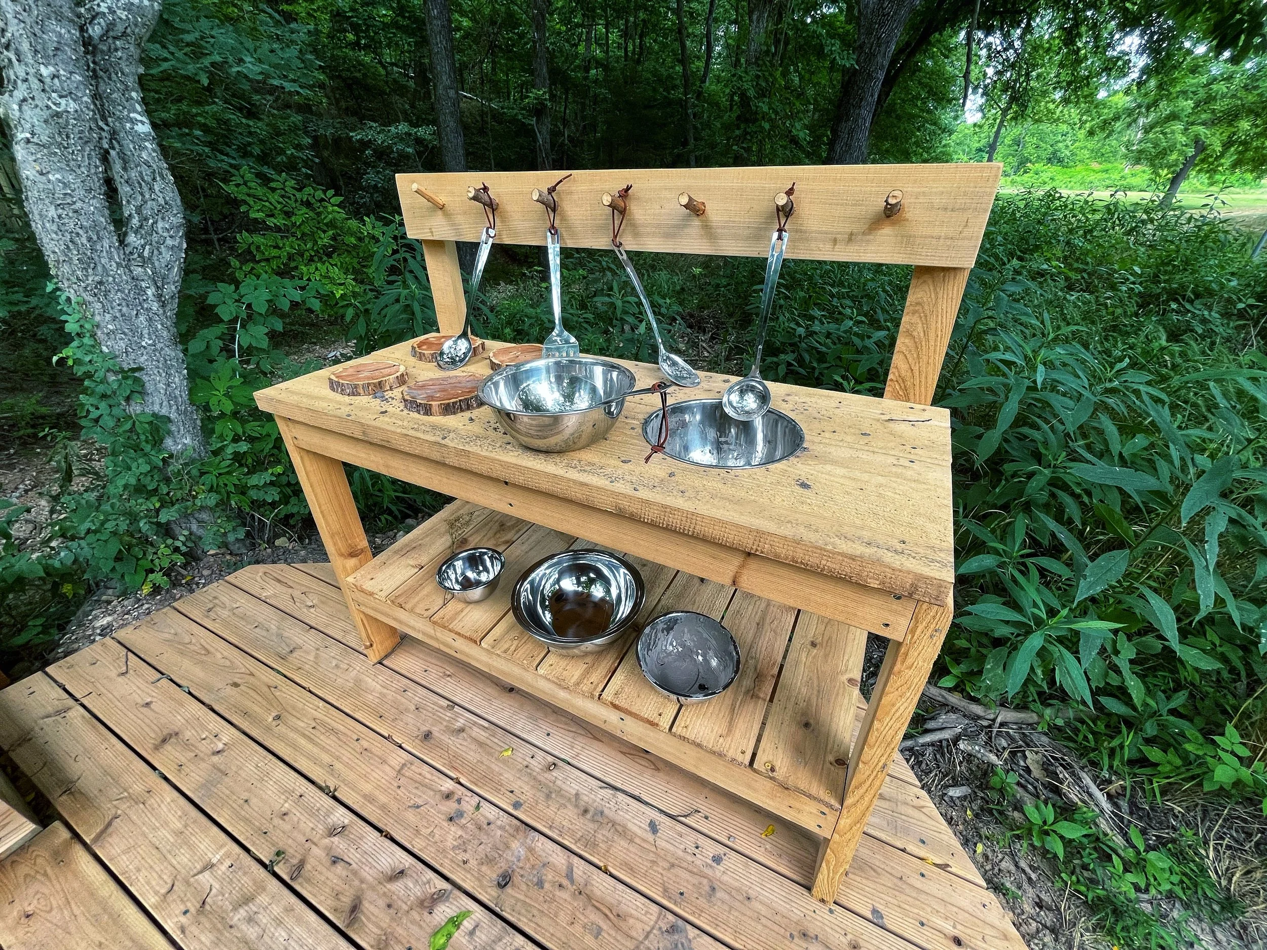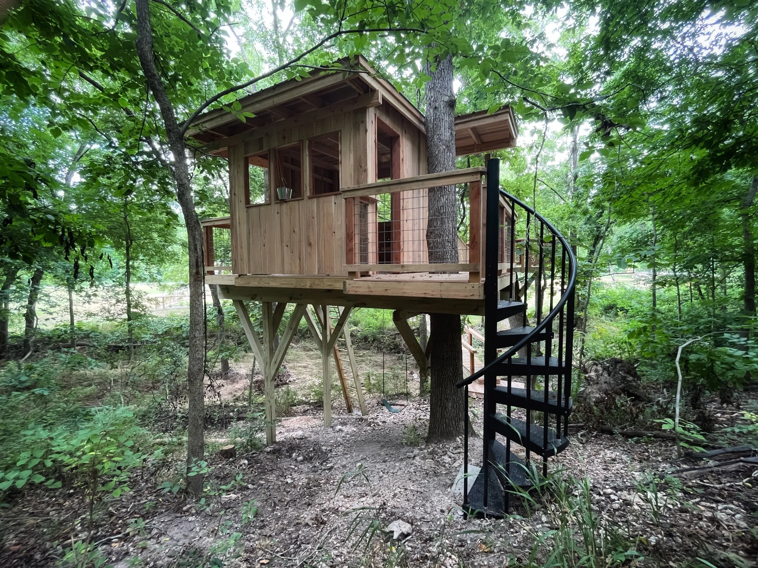 Backyard treehouse playground featuring multiple treehouse spaces and bridges, natural elements throughout and even a play “mud” kitchen.